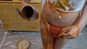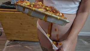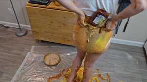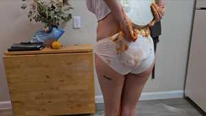 Jade wears some pure white cotton undies and a white crop top, and begins preparing a savory sludge pie! Starting with a base of grits, she tops it with tomato sauce and baked beans, and decorates with mustard and barbecue sauce. Now that this beautiful pie is prepared... it's going straight into her clean, perfect panties! The white fabric is quickly ruined with all the slop, but holds the mess well. They sag and slip down her bottom, but she keeps filling them and giving herself messy wedgies!