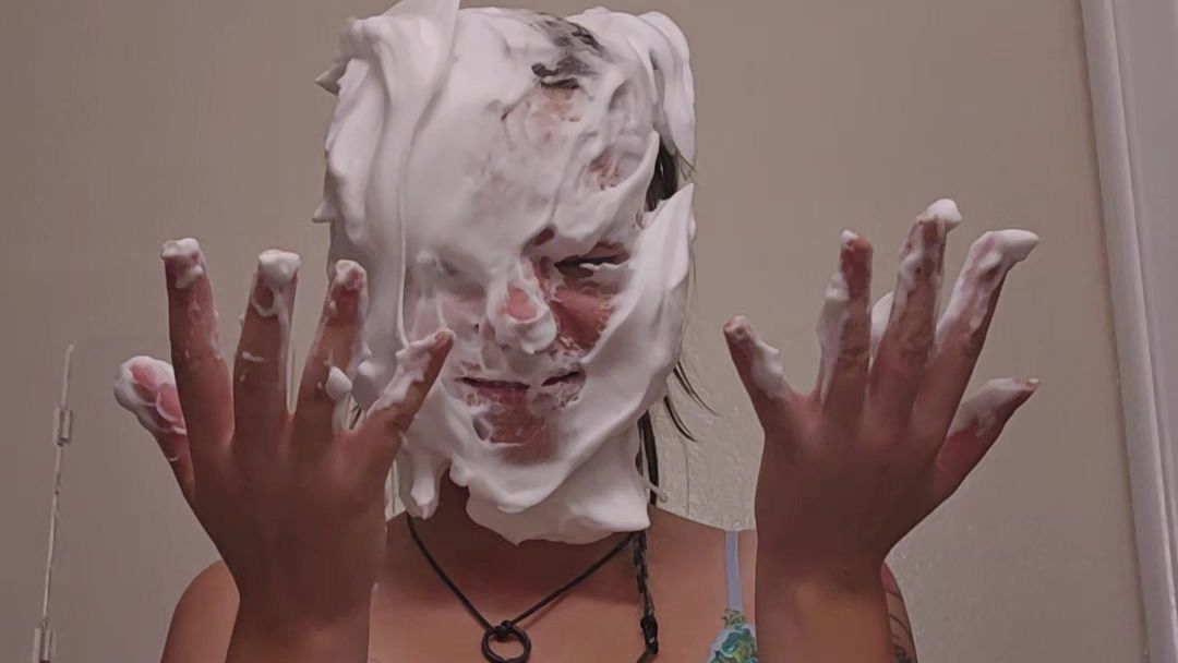 Jade tries to answer some trivia questions Danny Libido has for her, and totally flops! She takes a shaving cream pie for every wrong answer, and the foam stacks thicker and higher on her head. She looks so goofy! At least her mesh embroidered lingerie is cute.